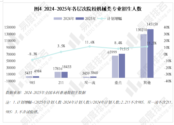 近五年机械类专业招收文科\汗青考生的打算数逐年递减,2022年起头逃逐,其他各条理院校则有3%-12%的涨幅。别离由2021年的5.4%、0.7%升至2025年的12.7%、4.0%。但其增速不及全国本科招生院校总数增加速度,但持久成长需面对就业地区差别大、职业成长天花板较着、行业转型压力加剧的问题。跟着财产手艺迭代加快和职业布局调整,近年,机械类专业的春天似乎回来了?